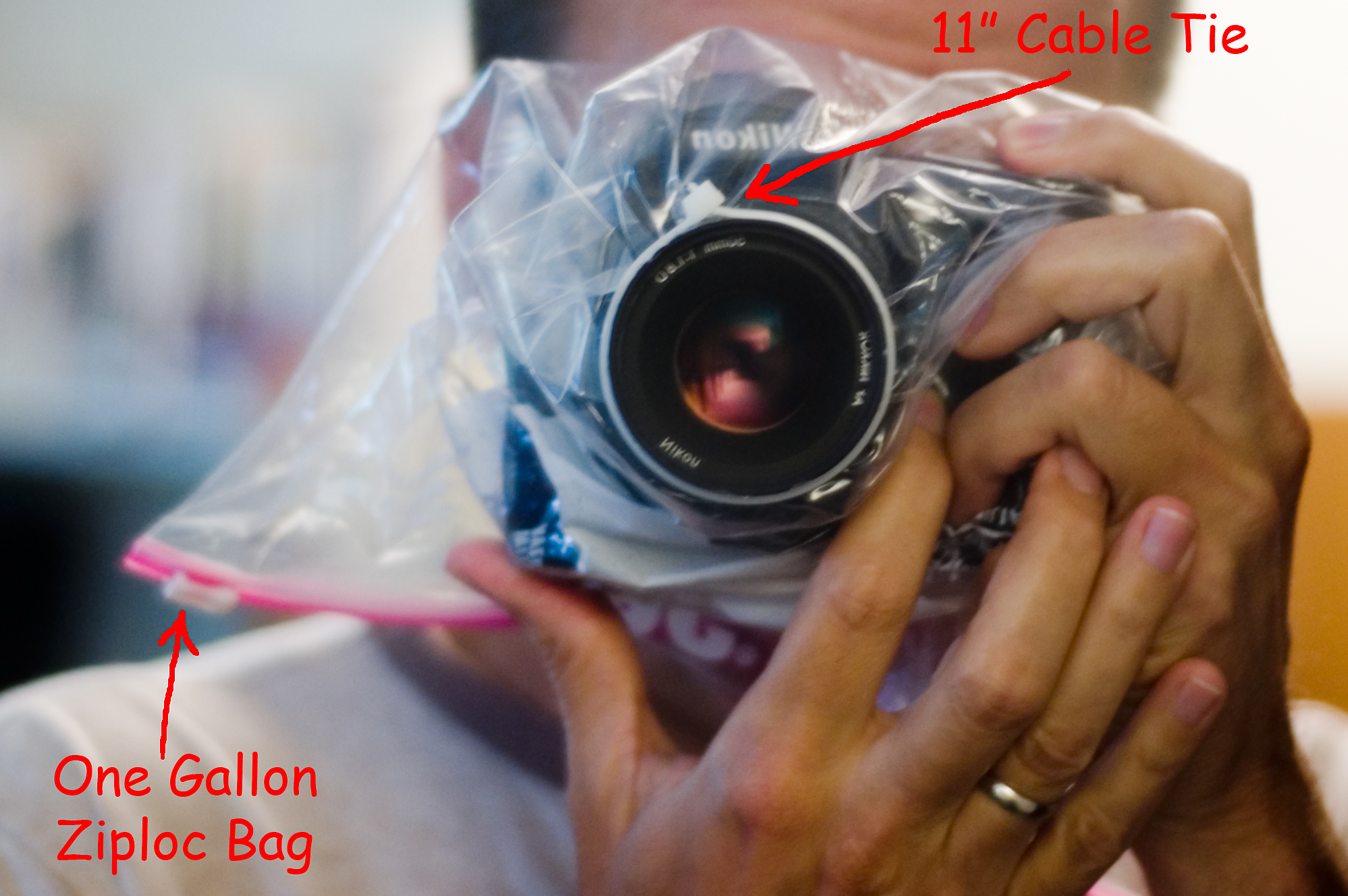 - You’re Done! When you’re walking around, keep the ziploc closed, and just shoot holding the camera in the bag. back in your tent, you can open and close the zipper side to plug in the camera, or charge it. Bring extra ziplocs, tape, and x-acto in case the bag rips while out thereFOR EXTRA PROTECTION, USE 2 BAGS (in case one rips)